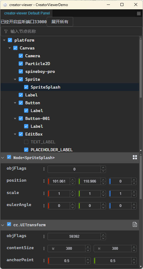 如有需要在自己的项目中测试的,可以将assets中CreatorViewer.ts脚本放到自己的工程下,然后在适当的地方调用 globalInfo.bridge.connect();(如果是局域网运行,需要记得修改为启动了监听插件的ip,端口默认33000)