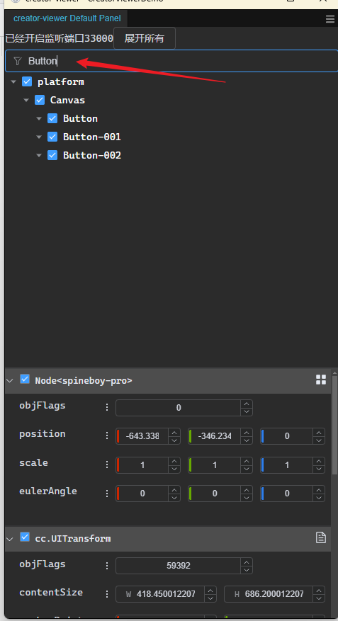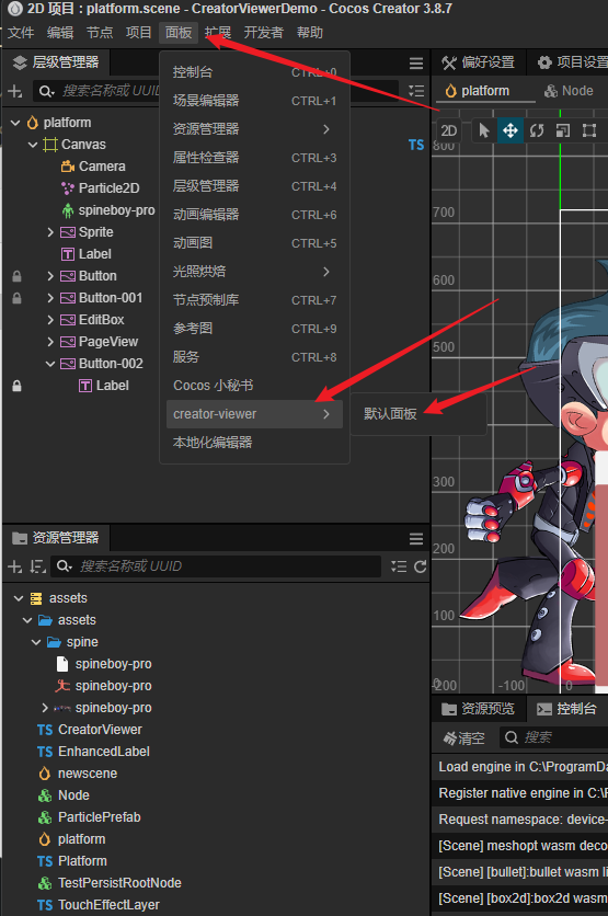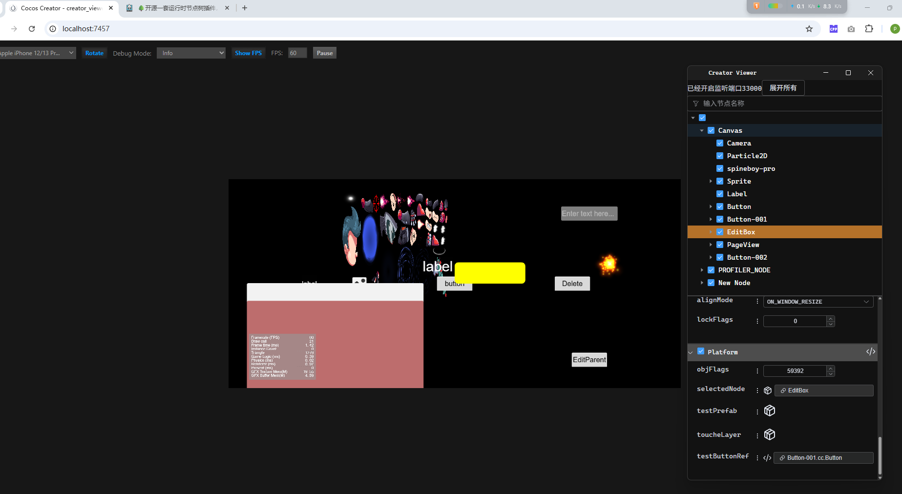 尝鲜的demo的项目导入到编辑器中,运行platform场景,然后通过面板中的creator-viewer打开面板