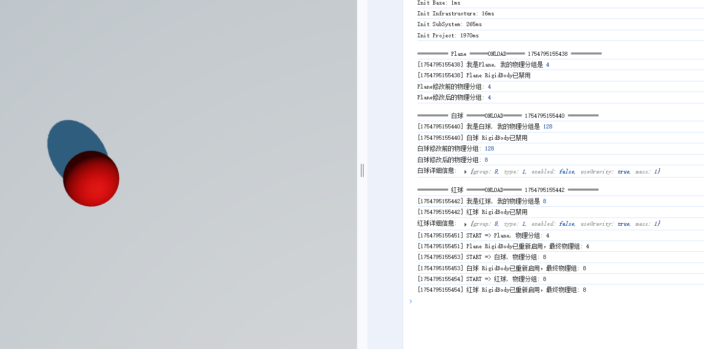 如图, onload的时候设置白球的物理分组为 和红球相同的物理分组, start后白球没有被地板拦截,红球是正常拦截无论是否onload 禁用 rigidbody 结果都是白球无法拦截