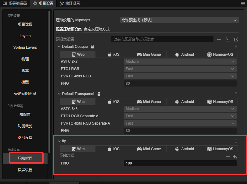 自定义压缩类型选 png jpg压缩80%就行。其他的压缩方式说实话,只是增加包体,对于很小的游戏没有太大的意义