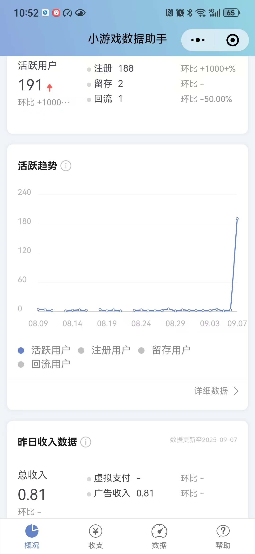 小游戏今天上了个新版本,想着买买量测测数据呗,结果一买一个不吱声。100元换回来180多个注册用户,一共看了40个激励视频,我。。。滴。。。妈。。。呀!!!!!!