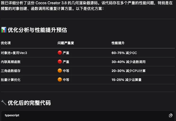 通过Profiler定位到性能开销最大的Component后,将其源码和性能数据喂给AI(推荐Claude 4.5),让AI分析瓶颈并给出优化建议。但这种方式需要对引擎底层架构非常熟悉, 大部分修改都不能直接用, 比如AI优化完GeometryRenderer自己又修改了很久才能跑起来.