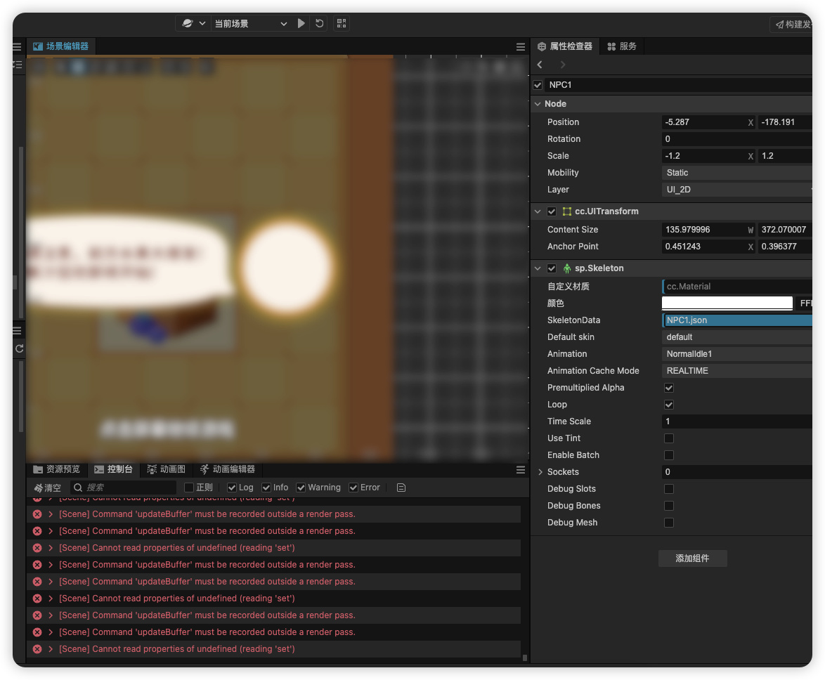 尤其是动了spine动画后 ,场景编辑器就卡着不动: 1.每次撤回对spine节点改动后,spine在编辑器就显示不了。切换场景或者重新打开才会显示。 2.给spine添加错误材质后,再移除材质,场景编辑器会卡着不动,这时切换场景也不行了,要关闭重新打开ccc。