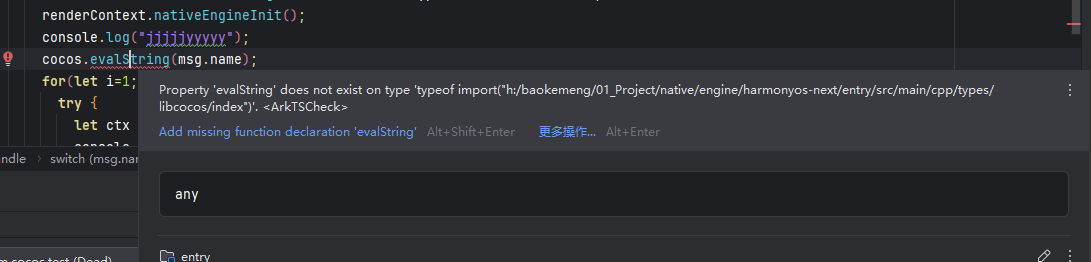 问题描述:ArkTS 无法用evalString调用 Cocos 引擎脚本,uiPort无法受到evalString消息。