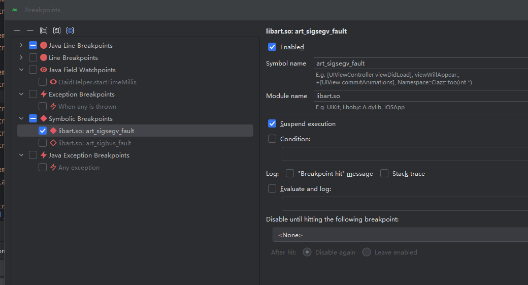 如图,debug configurations 里面设置 debug type 为 detect automatically时,每次debug app都会自动触发断点: