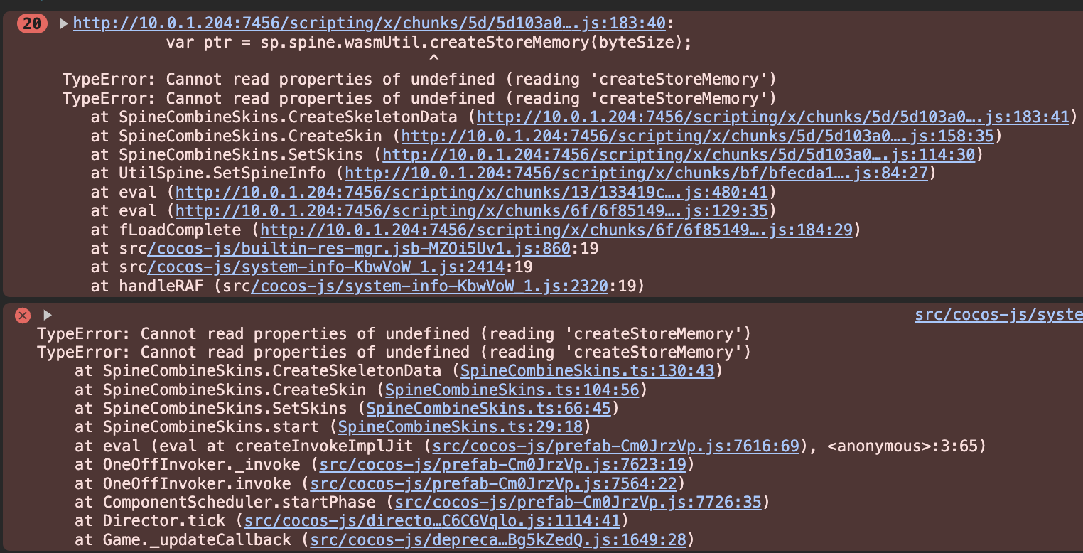 重现方式:在项目内调用spine.wasmUtil的方法时提示wasmUtil为undefined。调试看spine确实没有wasmUtil的属性,但是浏览器预览和编辑器预览都正常。模拟器想调试spine-define.ts的overrideClass方法在debugger里也找不到代码。