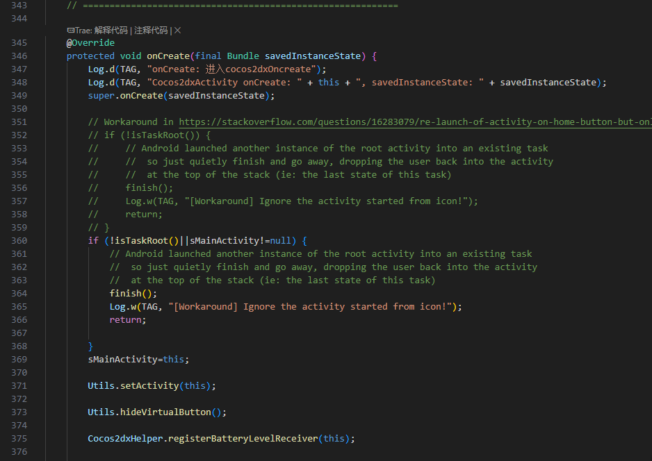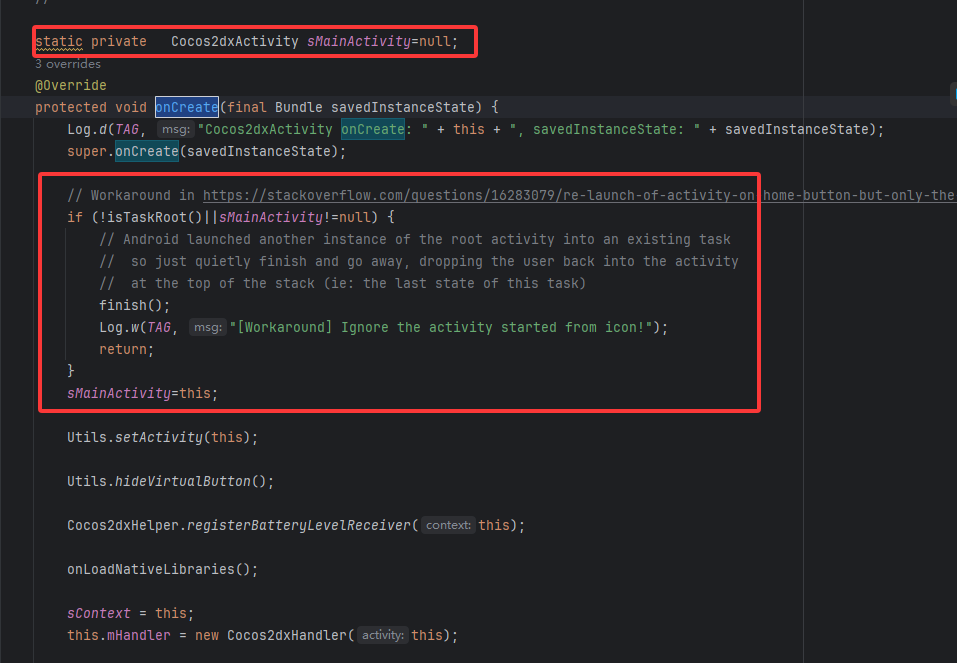 Cocos2dxActivity的launchMode被设置为单任务(singleTask)这个能保证大部分情况下,Cocos2dxActivity不会被重新创建,但是不能保证100%不会