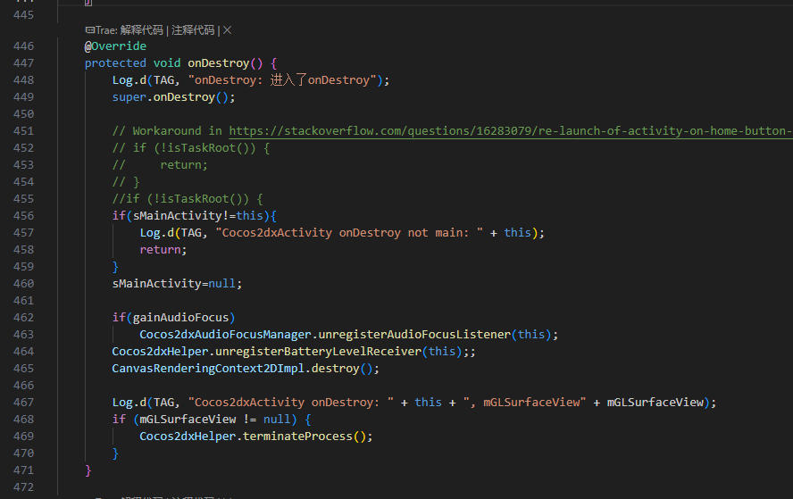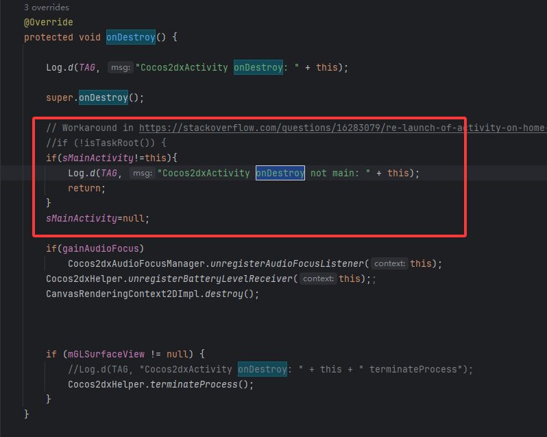 进程中只能成功创建一个Cocos2dxActivity,我们记录下这个成功创建的Activity,在它被销毁时,我们要保证游戏进程被杀死,因为后面没办法再继续工作 。