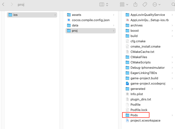我cocosCreator 3.8.7 导出 ios工程 ,最近接AppLovin SDK。 选择自动化pod。但是pod文件存放在game/build/ios/proj 路径下,生成的所有sdk文件也都在game/build/ios/proj 路径下,但实际打开project.xcworkspace工程文件build的时候却提示project/native/engine/ios路径下找不到 AppLovin SDK相关文件。