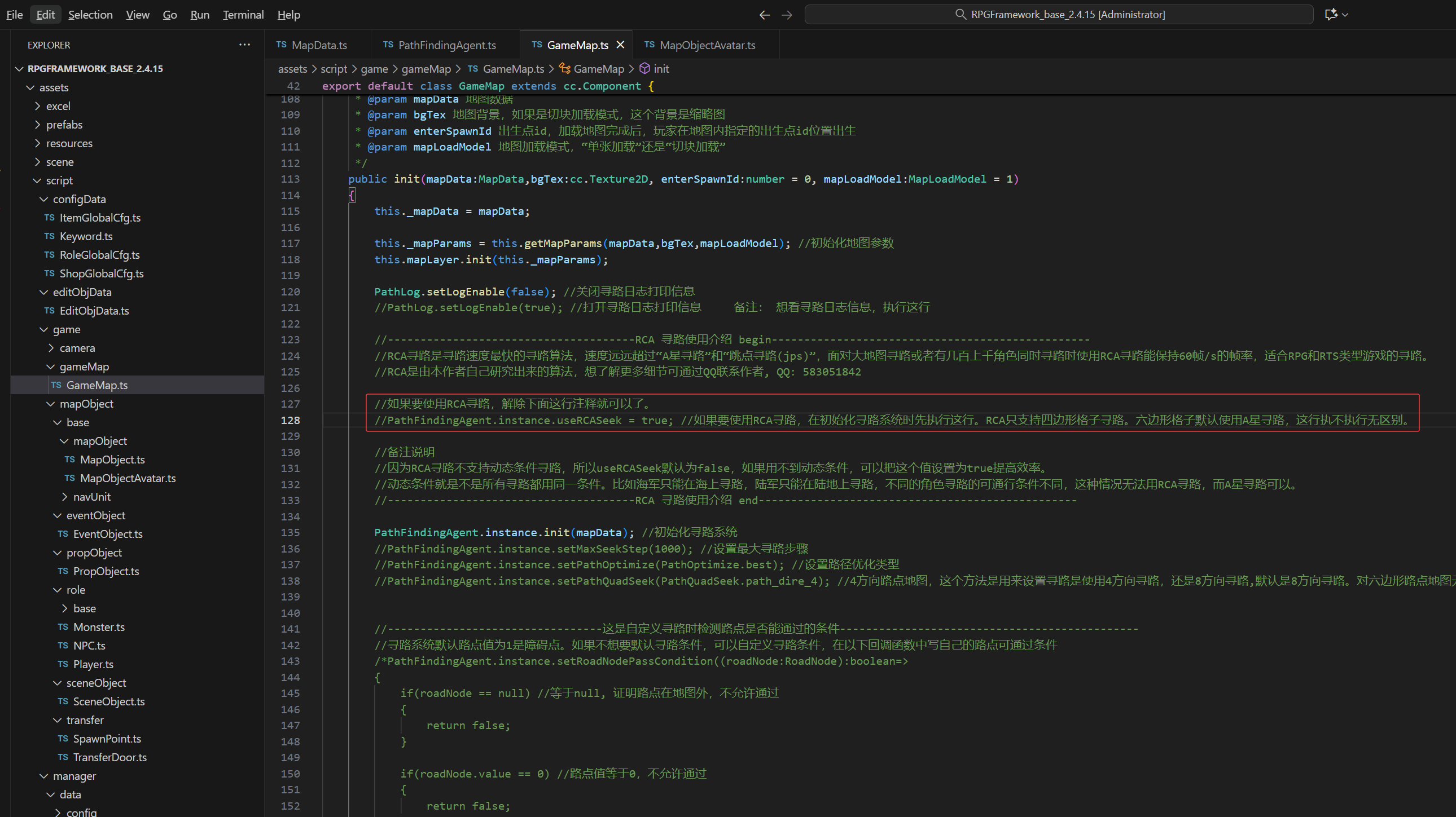 相关源代码已经集成到前端地图框架内,在初始化寻路算法前,只需设置 PathFindingAgent.instance.useRCASeek = true;就可以用了,如下图