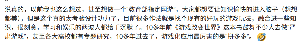 我明白了,为什么我和搞教育的那帮人讨论这个问题,他们一般都是认可的,而和搞游戏的人谈论这个他们一般不认同,原来,搞教育的会从教育的角度看待这个问题,这种方式是缓解了传统教育的痛点,而搞游戏的大多从娱乐游戏的角度看待这个问题!认为降低了游戏的娱乐性!尽管我说了,这针对的人群是受教育者,但是他们大多依旧是从大众娱乐游戏的角度看这个问题!