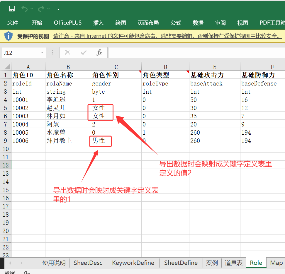 在关键字定义表,配置有关键字名“男性”和“女性”并且对应值为“1”和“2”,所有在Role表里给int型字段填“男性”和“女性”,导出数据时会被转换成“1”和“2”。