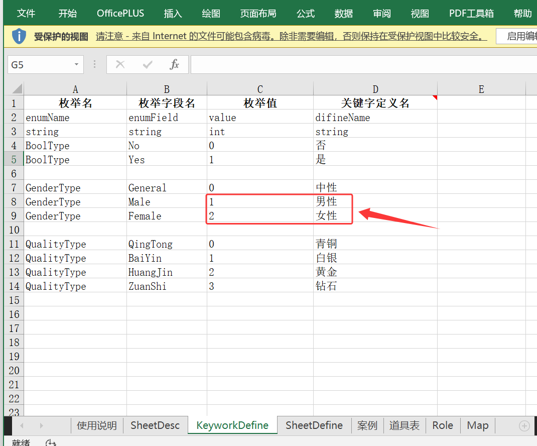 2、关键字定义表,命名为“keywordDefine”或“关键字定义表”二选一,是用来给某些关键字做类似于宏定义一样的功能,供给其它表用,并且这个表会被导出枚举脚本。比如这个表把 “人”定义成 “1”,那么其它数据表的数值字段填“人”,导出数据时都被转换成“1”。