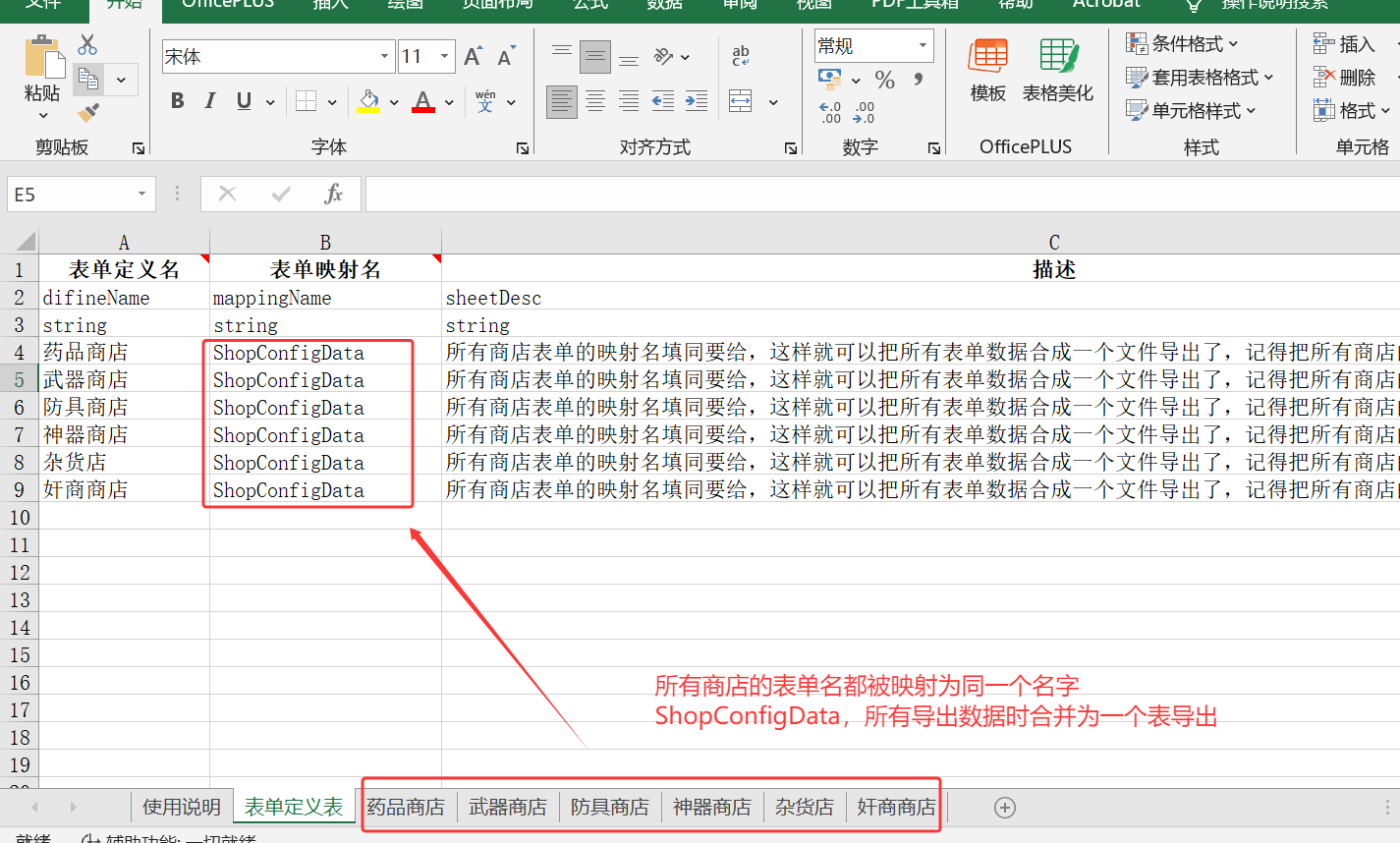 下图中,有几个商店配置表单,在表单定义表内全部映射为同一个名字,所以所有表单都会合并为同一个表导出,合并的好处是资源是资源统一管理统一加载。对了这几个商店表单的字段名都是一样的。