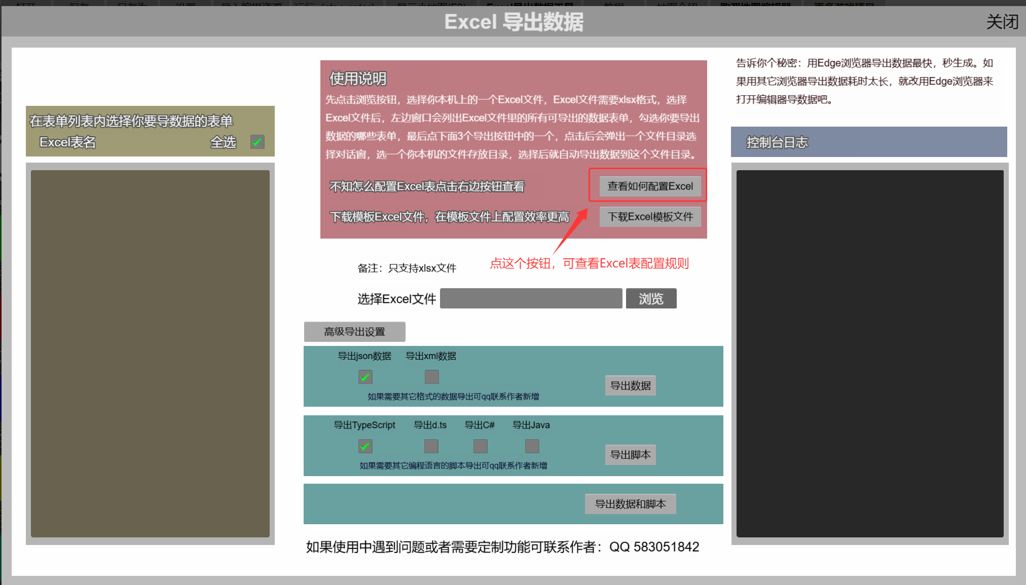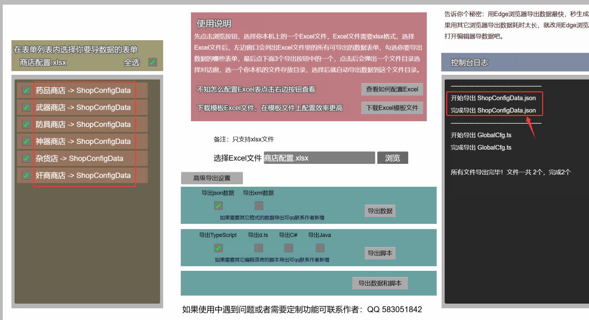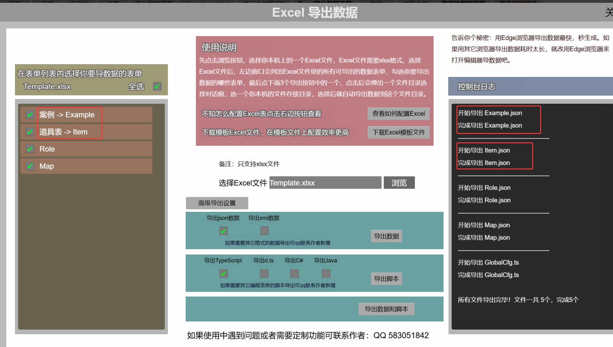 在上面界面截图种,点击那个浏览按钮,选一个Excel文件,文件只支持xlsx格式,然后点击“导出数据”或“导出脚本”,会弹一个系统文件目录选择窗,选择一个保存目录就自动导出了。数据支持json和xml,脚本支持ts,d.ts,c#,java。如果还需要其它脚本的或其它格式的数据导出可联系作者,工具上有作者的联系方式。