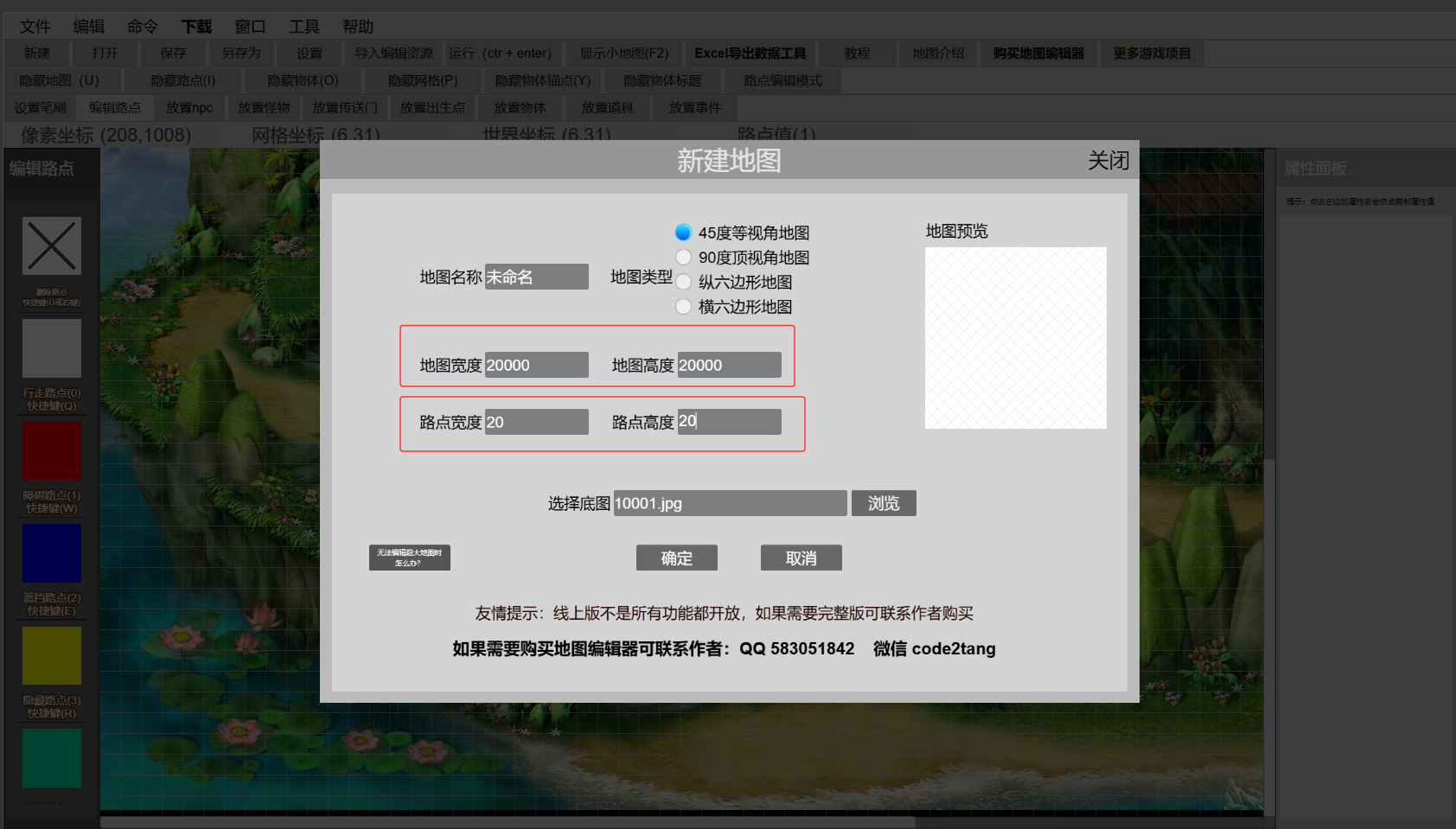 点击新建按钮,随便选一张你电脑的图片。设置参数如截图。地图大小为20000 * 20000,格子大小为 20 * 20。
