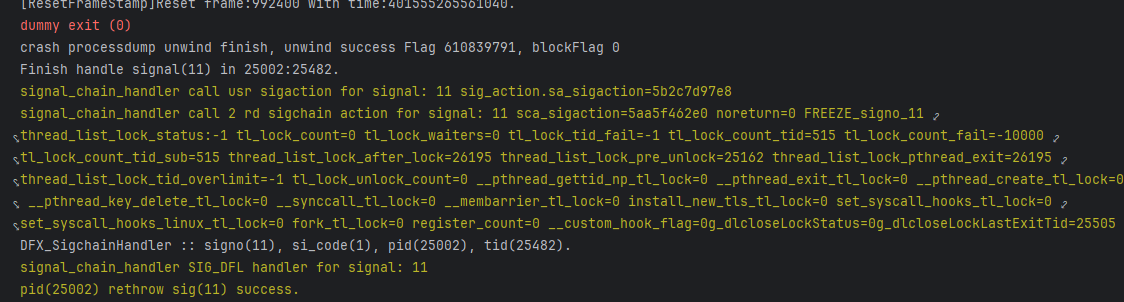 signal_chain_handler call 2 rd sigchain action for signal: 11 sca_sigaction=5aa5f462e0 noreturn=0 FREEZE_signo_11 thread_list_lock_status:-1 tl_lock_count=0 tl_lock_waiters=0 tl_lock_tid_fail=-1 tl_lock_count_tid=515 tl_lock_count_fail=-10000 tl_lock_count_tid_sub=515 thread_list_lock_after_lock=26195 thread_list_lock_pre_unlock=25162 thread_list_lock_pthread_exit=26195 thread_list_lock_tid_overlimit=-1 tl_lock_unlock_count=0 __pthread_gettid_np_tl_lock=0 __pthread_exit_tl_lock=0 __pthread_create_tl_lock=0 __pthread_key_delete_tl_lock=0 __synccall_tl_lock=0 __membarrier_tl_lock=0 install_new_tls_tl_lock=0 set_syscall_hooks_tl_lock=0 set_syscall_hooks_linux_tl_lock=0 fork_tl_lock=0 register_count=0 __custom_hook_flag=0g_dlcloseLockStatus=0g_dlcloseLockLastExitTid=25505