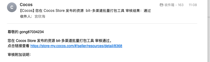 您在 Cocos Store 发布的资源 bit-多渠道批量打包工具 审核通过。