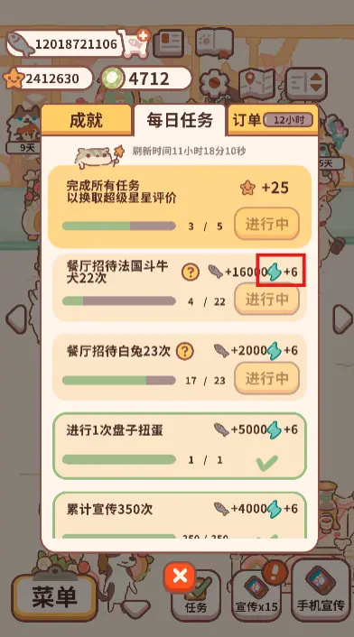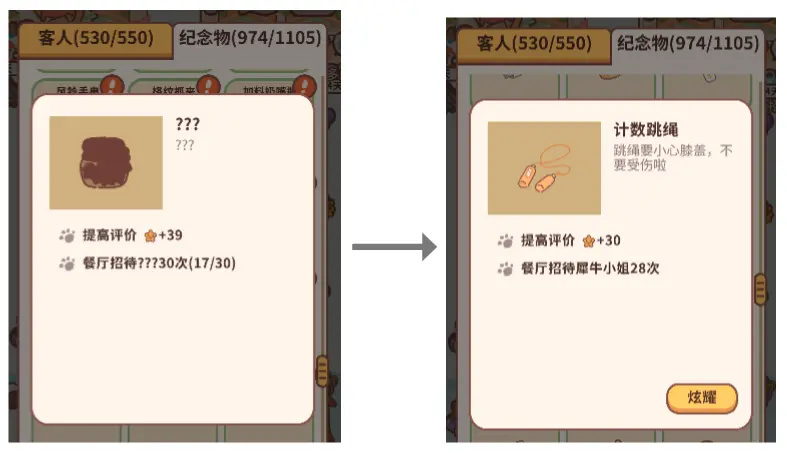 游戏对玩家的吸引主要是通过玩家想避免收益损害来完成的。即玩家在挂机的时候设置收益上线,比如对小费和餐厅离开时产生的收益设置上限,达到上限后玩家只能点击收获,系统才能继续产出。在初期可收获的点很少的时候,错开收获时间,可以使玩家经常回到游戏,但随着游戏场景的不断增加,可收获的点也越来越多,收获时间的设定则没有那么重要。