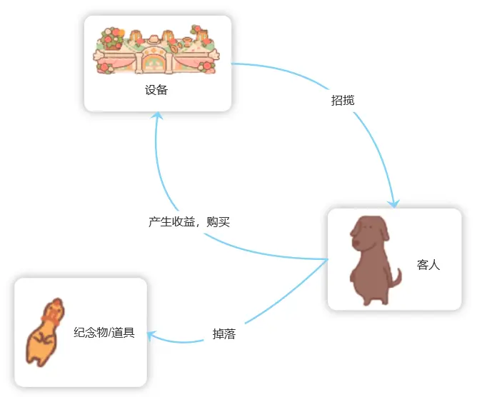 游戏以收集纪念物/道具为主。玩家积累财富,购买并升级设备,招来客人,换取更多财富,购买/升级更多设备,招来更多客人,循环往复。在此过程中,游戏会有机制掉落纪念品/道具。游戏没有明显的等级,店铺收到的评价的多少来,反映了玩家等级。因为评价仅能系统掉落,无法通过任何购买方式获得,也不会减少。此外评价的变化也是存档更新的标志。