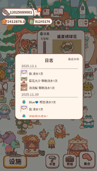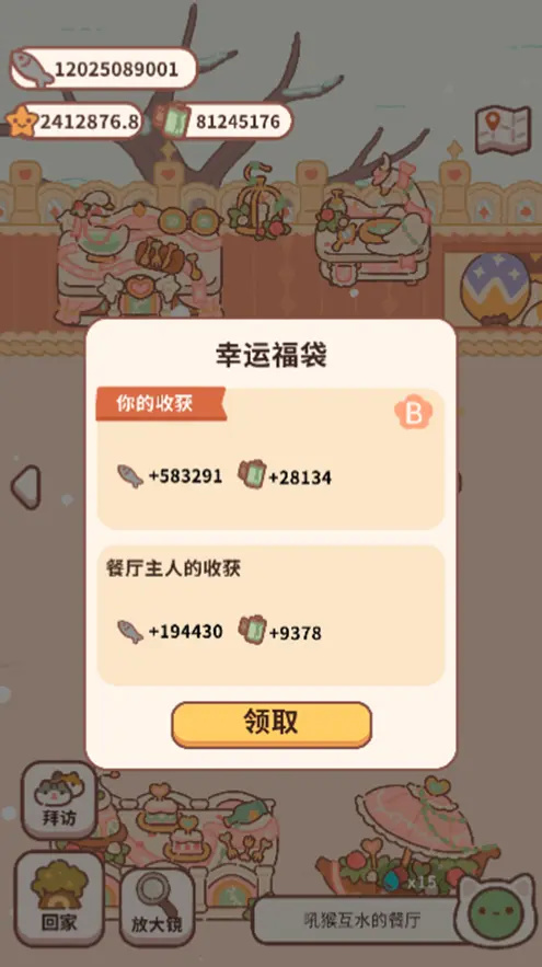 玩家粘性还来自于玩家之间的互动。游戏设置玩家互动环节,参与双方均可以获得收益。前院场景的浇树玩法,玩家游戏中互加好友后,就能给彼此的植物浇水,促进其生长。玩家能看到谁来给我浇水,这样就可以回浇以示感谢。而去对方店里寻找福袋则能直接给双方都带来小鱼干和胶卷等收获。互动能很好的召回流失用户,如果相互浇水的一对玩家,其中一方长时间未给对方浇水,他很可能会被对方提醒回到游戏,继续成为浇水搭子。