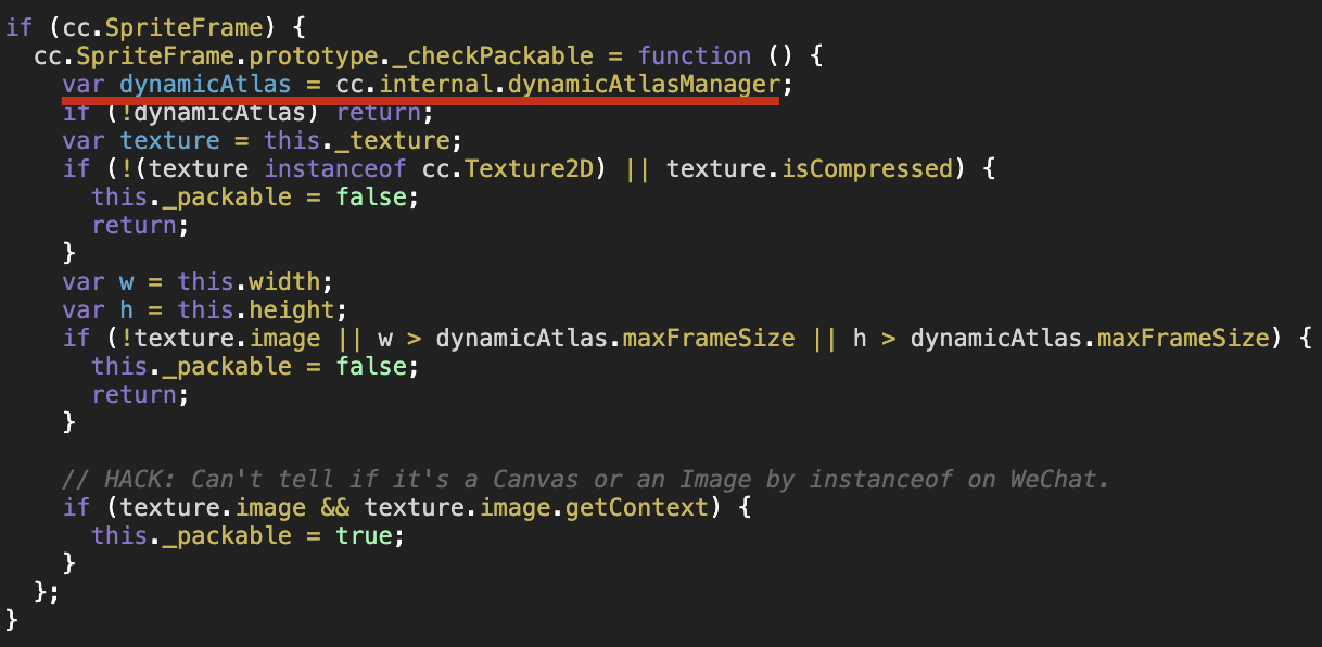 我的理解是 这里的cc.internal在这里是undefined, 因此无法访问 dynamicAtlasManager, 所以报错。