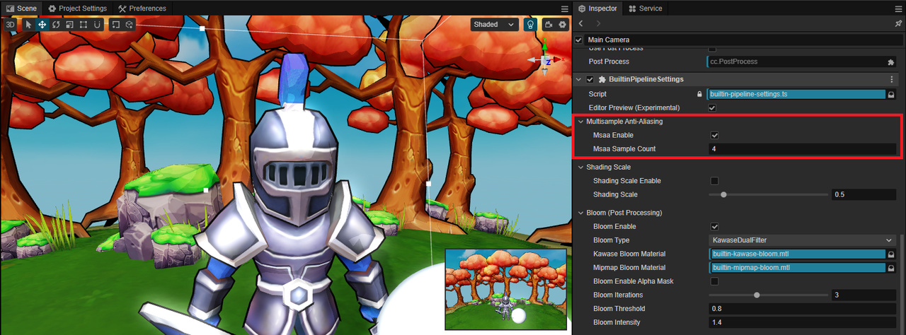 新增针对 WebGL 2 和 WebGPU 图形后端的 MSAA (Multisample Anti-Aliasing) 支持。至此,除 WebGL 1(因不支持离屏抗锯齿特性,暂无法适配)外,所有图形后端均已支持 MSAA。
