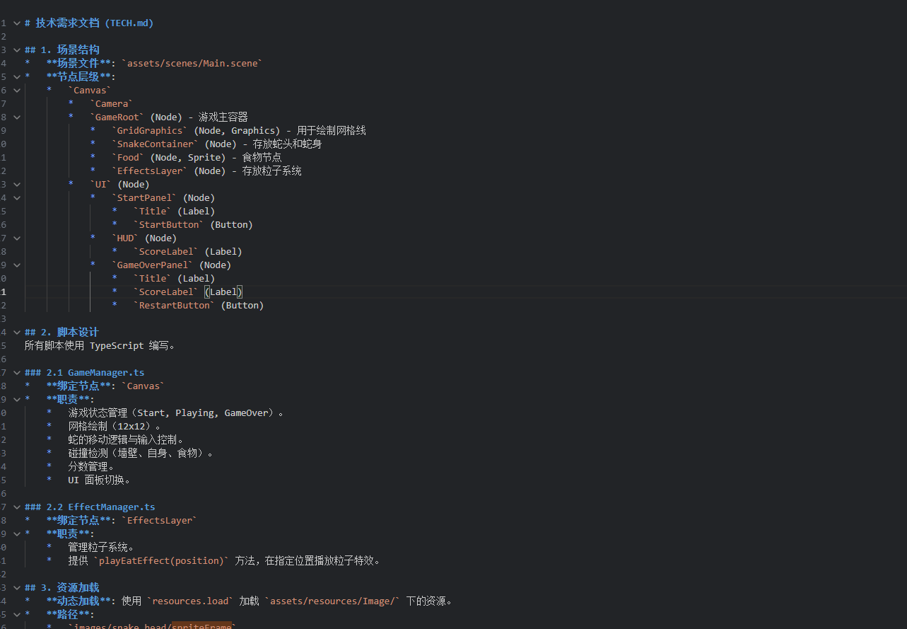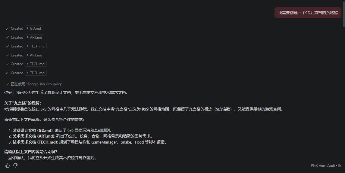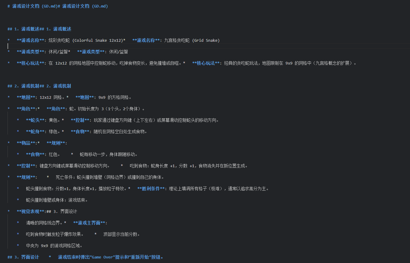 给他一个小小的玩法,会生成 技术文档设计文档 美术文档俺没有API,就简化了哈,一共3句话,实现了一个小小的贪吃蛇