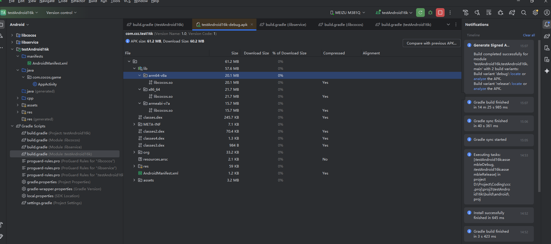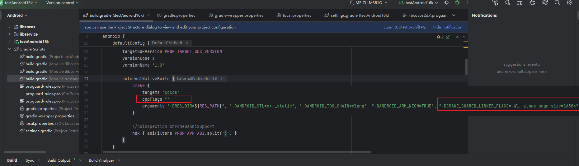 添加上编译的参数, 上面的cppFlags ““最好加一下 然后在arguments的后面加上”-DCMAKE_SHARED_LINKER_FLAGS=-Wl,-z,max-page-size=16384”, 都处理完后重新编译项目,在编译之前需要清空下项目缓存,等待漫长的编译,最后: