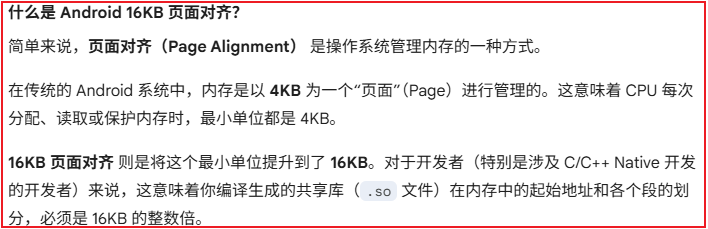 重新编辑下: 我以为已经很多人知道这个 **Android 16KB 页面对齐(16KB Page Alignment)**问题, 所以我就简单的写了16k问题, 重新补充好标题.另外补充AI的回复