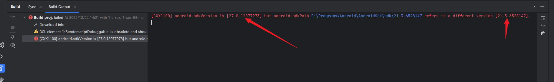 升级完成后,你build发现还是无法运行,提示ndk错误,