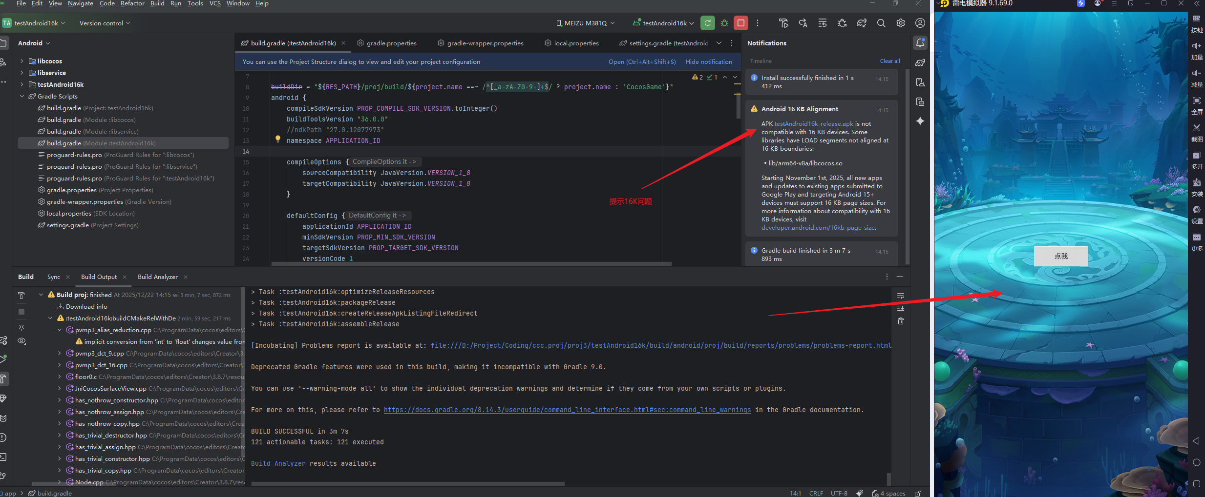 然后清空下项目, 重新编译, 如果没有别的什么问题, 你的项目是可以正常运行了,此时studio会提示16k问题,项目是能跑的