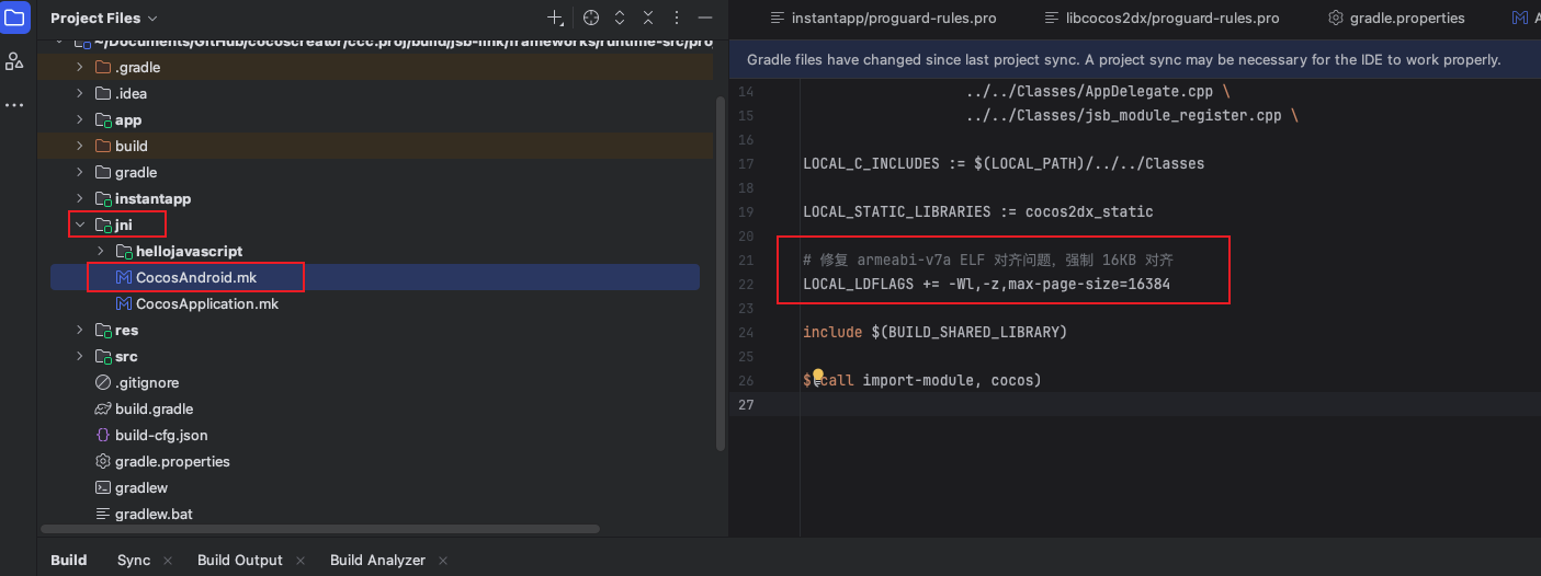 为了避免每次构建每个项目都需要重复修改,你可以将修改抽离到ccc.proj/build-templates/jsb-link/frameworks/runtime-src/proj.android-studio/下面