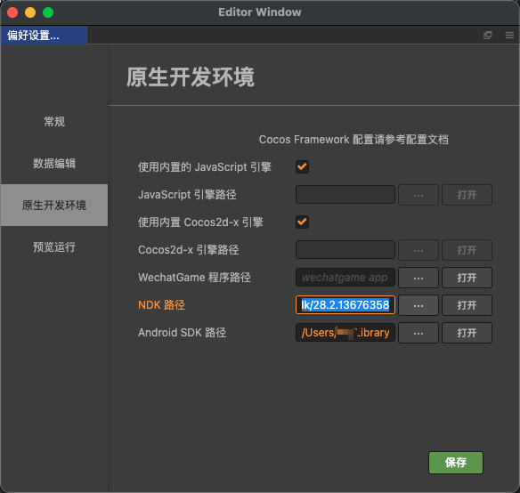 再回到CocosCreator中将原生开发环境设置为刚才下载的ndk版本