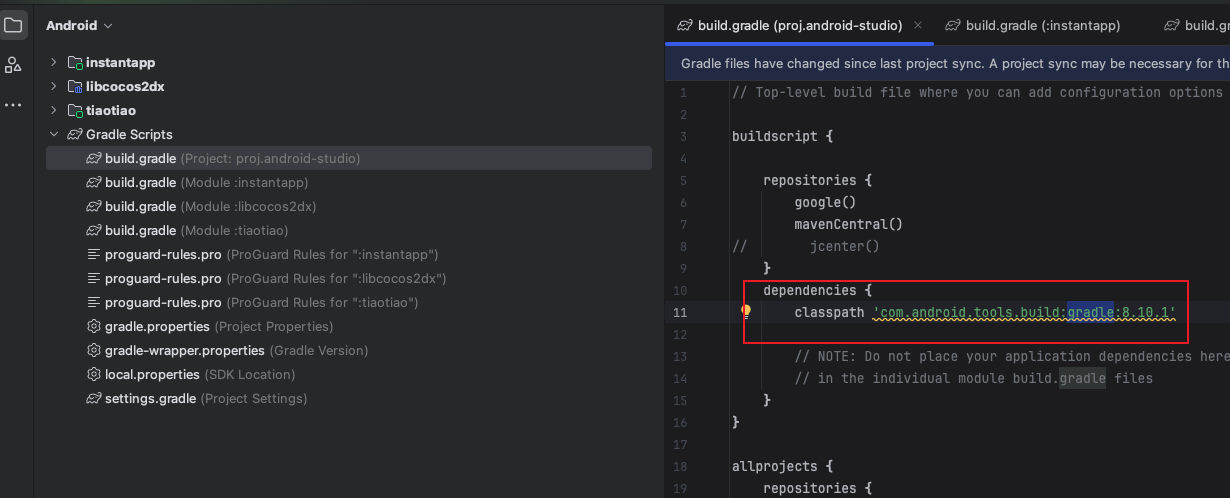 1、修改ccc.proj/build/jsb-link/frameworks/runtime-src/proj.android-studio/build.gradle中的Android Gradle Plugin Version版本为8.10.1。