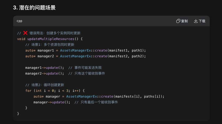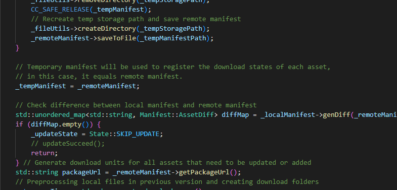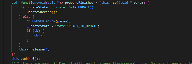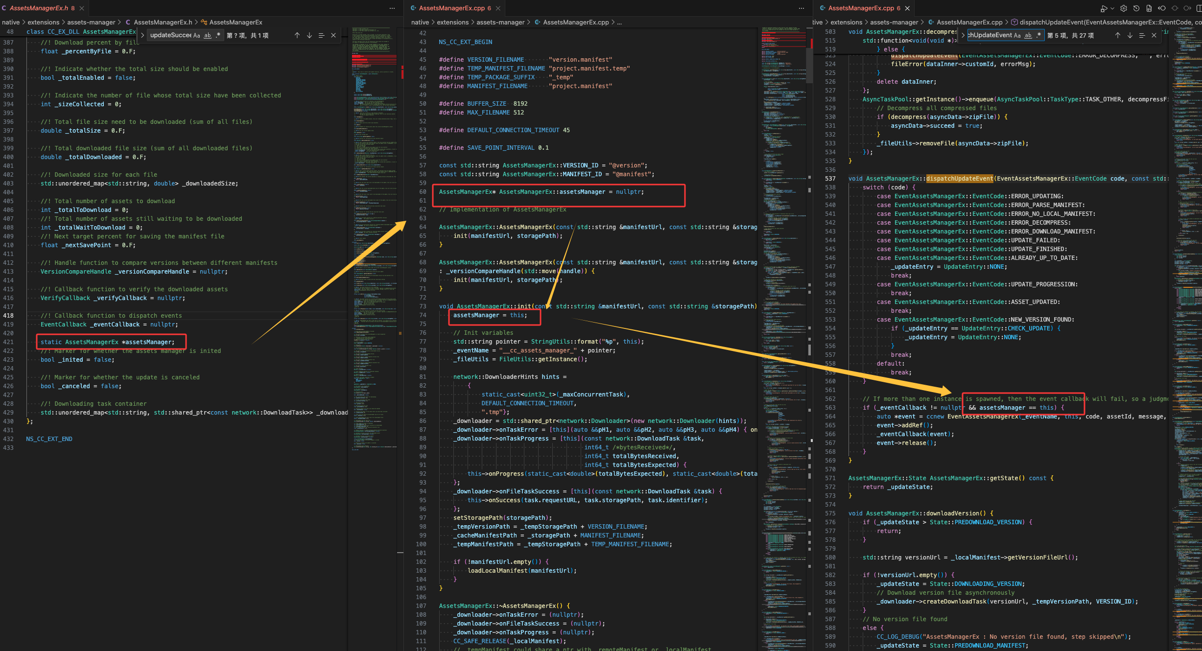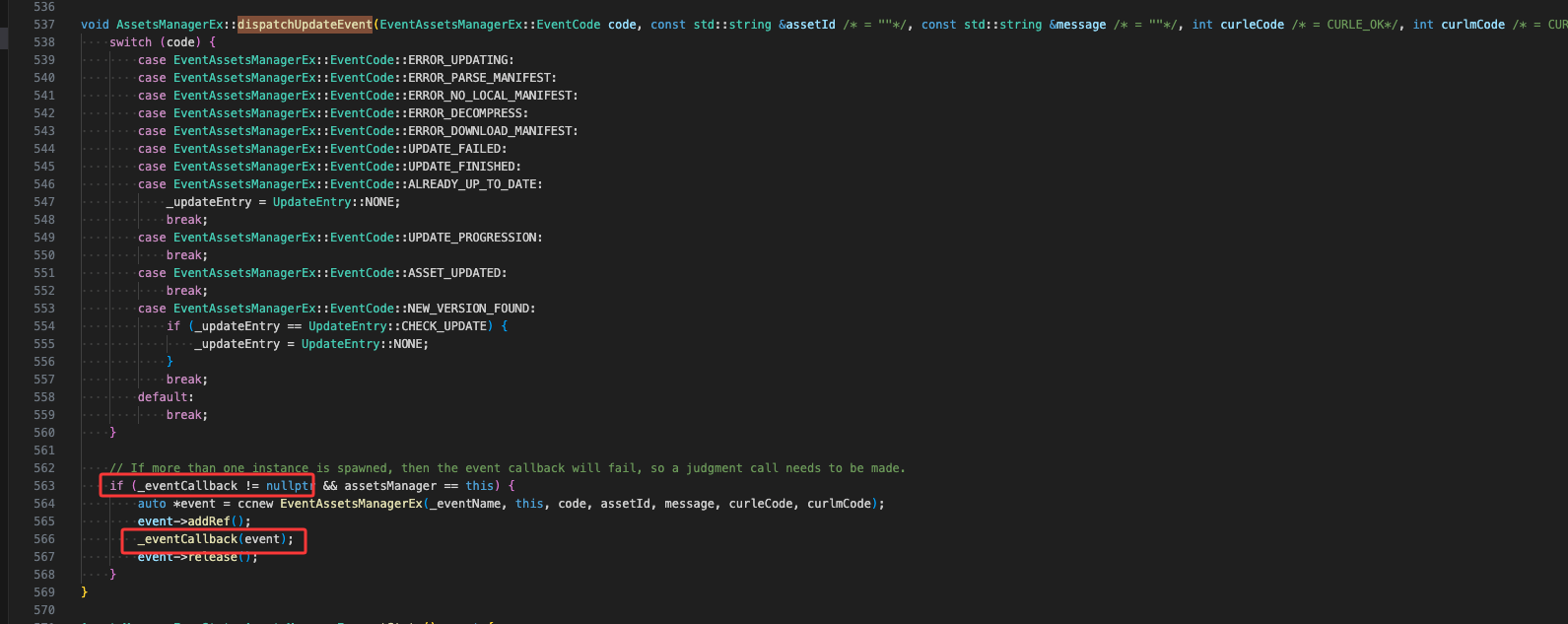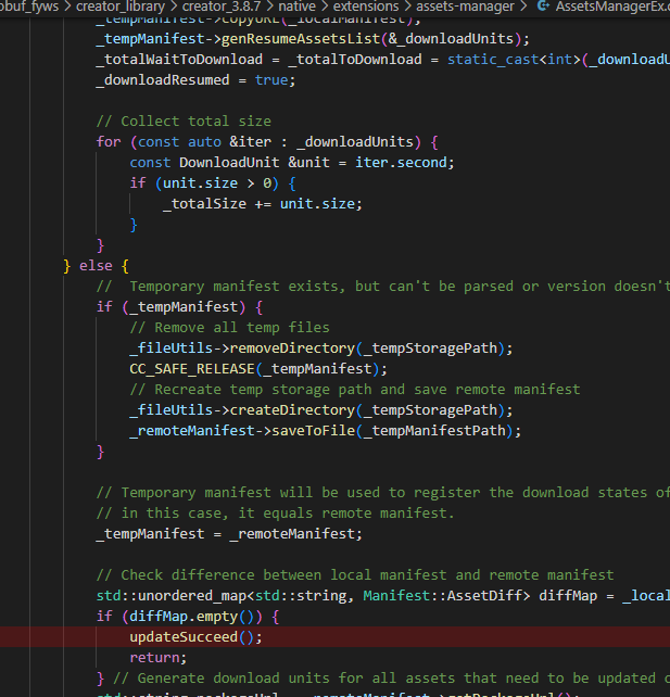 如果版本号不一样,但是文件md5一样,会导致diffMap是空的,直接运行updateSucceed,会给js发消息dispatchUpdateEvent(EventAssetsManagerEx::EventCode::UPDATE_FINISHED);直接导致_eventCallback的时候闪退