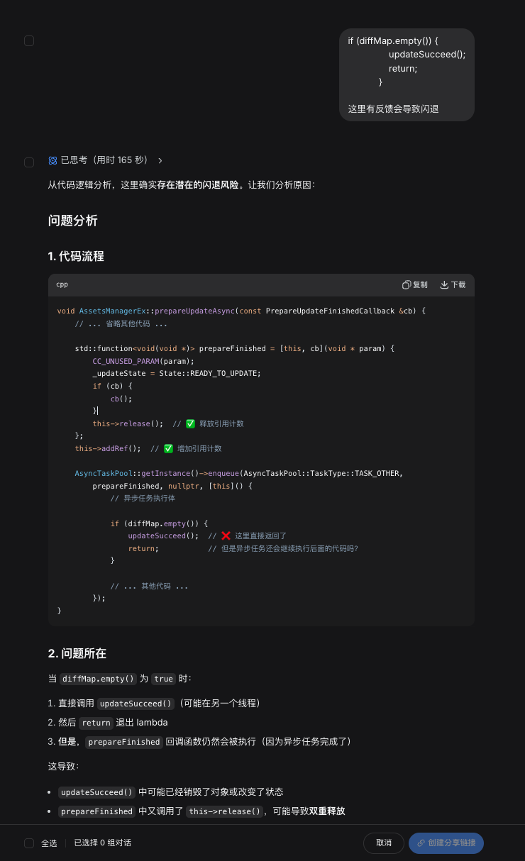 能进去的运行过去了,我们发现是在新开的线程里面运行必定闪退,如果去掉AsyncTaskPool::getInstance()->enqueue就没有问题