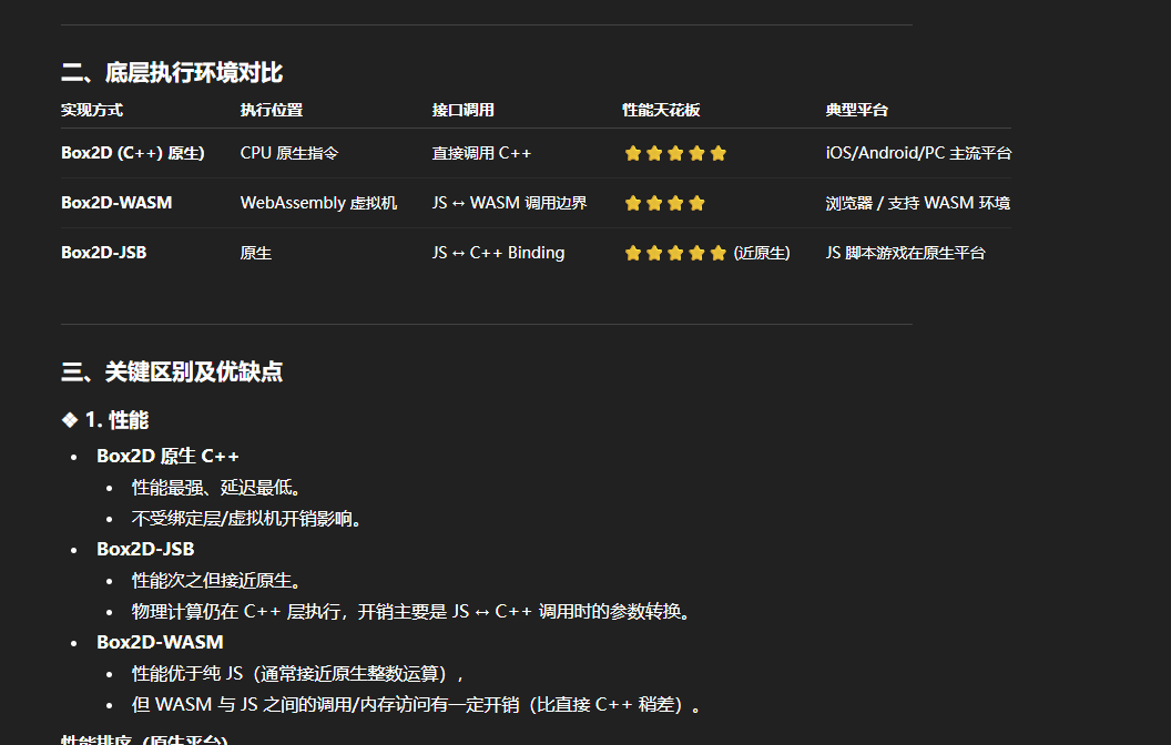 3.基于box2d的2d物理引擎;基于box2d-wasm的物理引擎;基于box2d-jsb的物理引擎,这三个有什么区别,原生平台上用哪个性能最好?