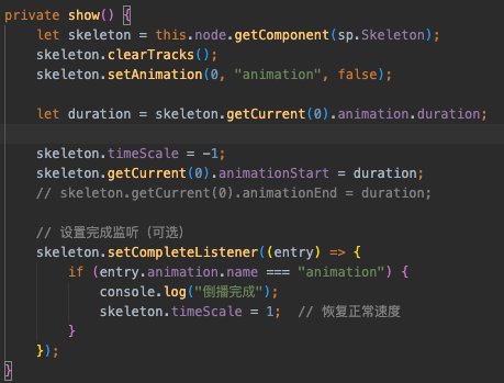 skeleton.setAnimation(0, “animation”, false).timeScale = -1;