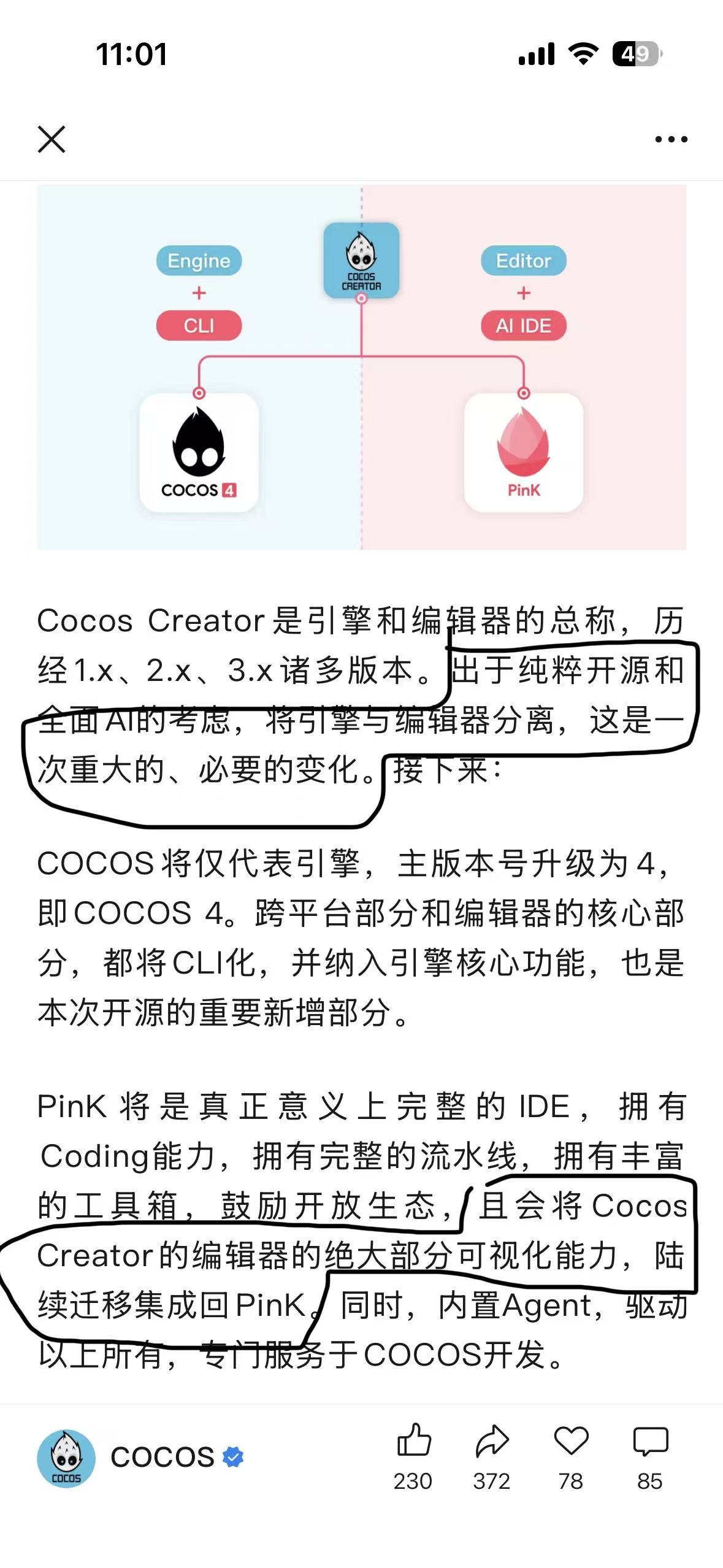引擎继续有人维护至少cocos不会死了。没用过pink,如果pink能平替编辑器那也还好。引擎和编辑器的耦合估计代码里面是注解或者宏定义的吧。我感觉改动不会特别大,我倒是好奇pink能不能平替现在的编辑器。来个懂哥说下