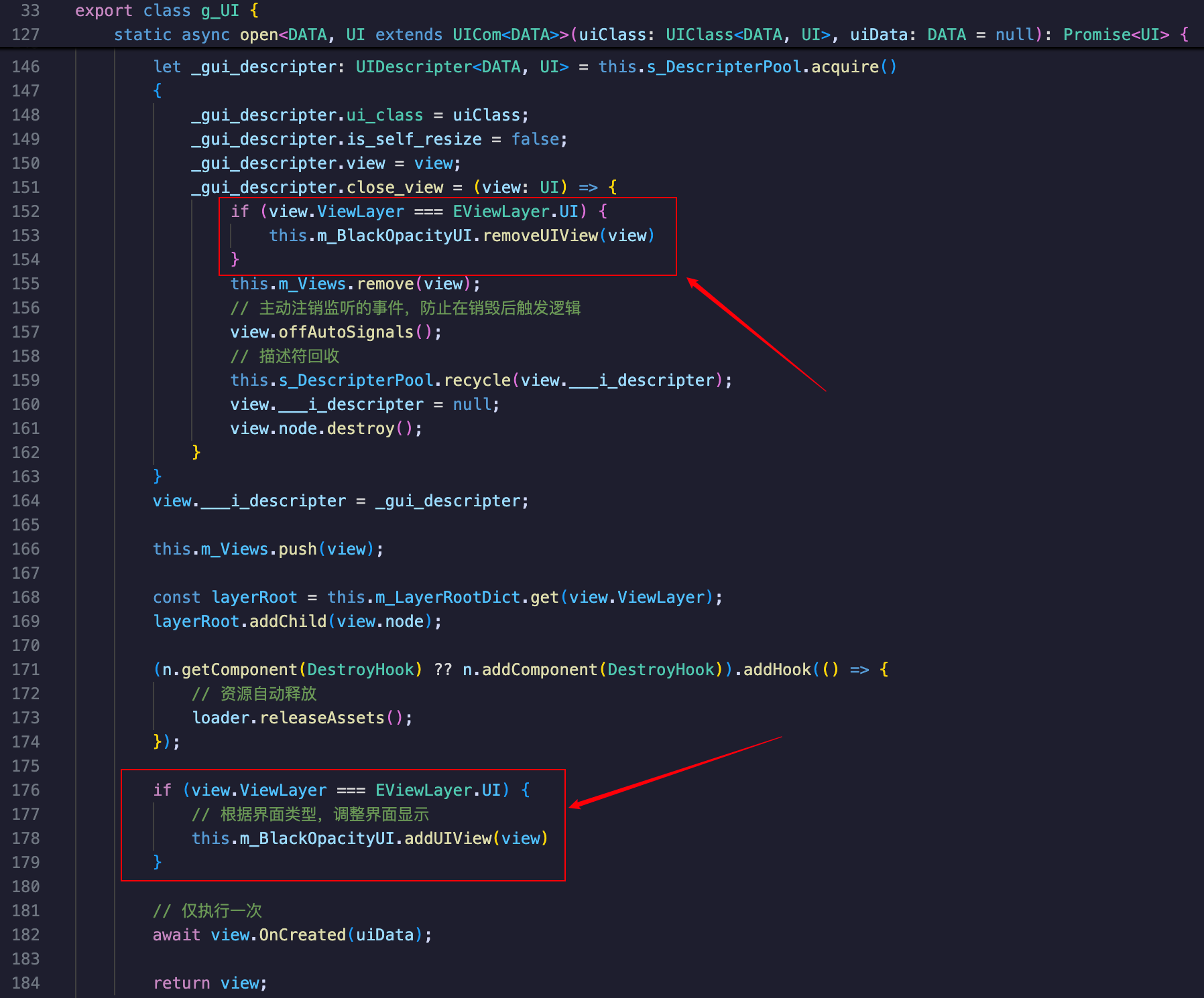如果是新增 UI 层的界面,那么调用增加和移除函数(后续由半透明遮罩层根据新的界面去调整自身层级和透明度):