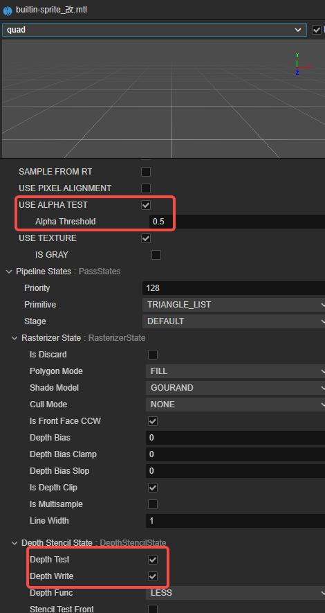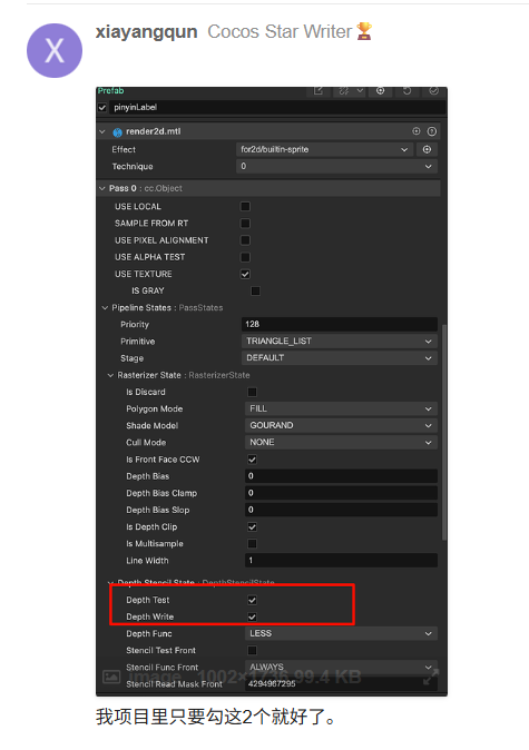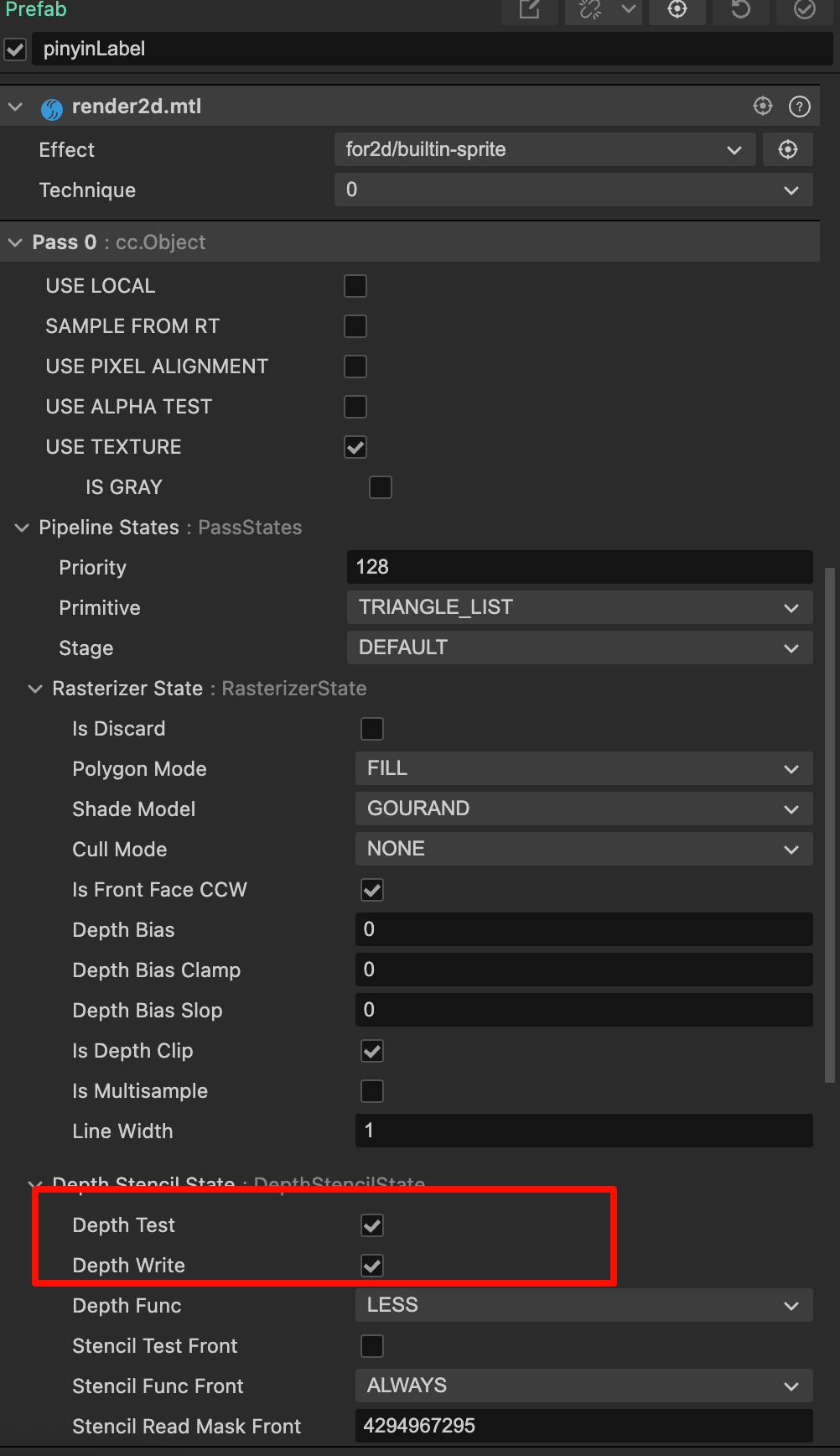 然后我又拷贝出来了builtin-sprite.effect,给他的depthTest打开,depthWrite关上,blend打开,当材质挂给Label