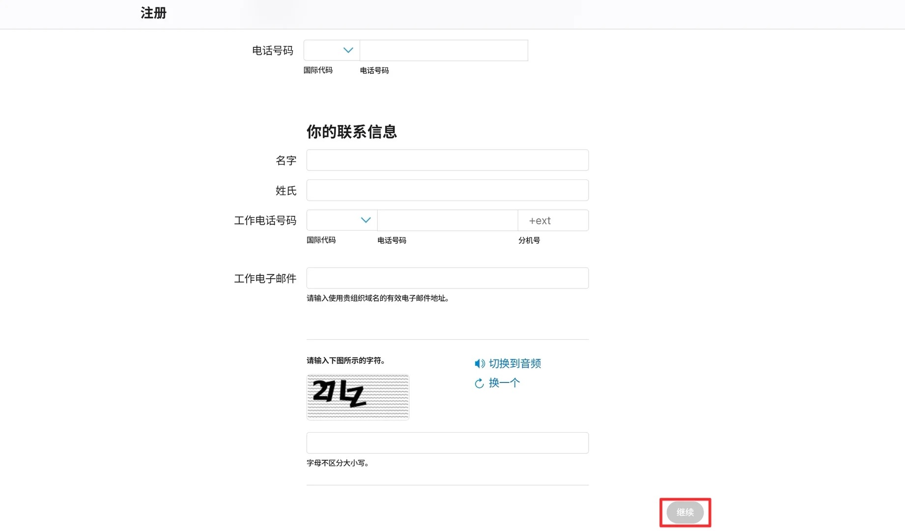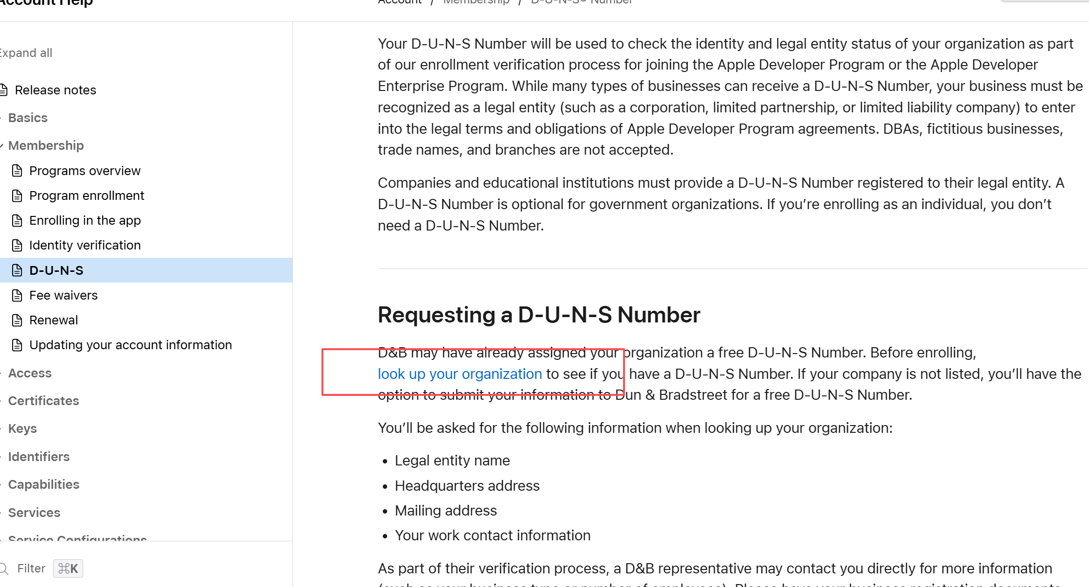 选择 我经营一家国际性企业 选择苹果开发者 点击后会跳转到苹果网站在邮件正文,找到蓝色字样“look up your organization”,点进去。先填验证码,会跳转到填写页面,把信息填写完整。 填写企业相关资料,提交对应的营业执照,这里一定要注意,不要连续点击提交,有风险被系统误判为重复提交,因为一天内只能有五次的提交机会。提交完整后苹果会把订单发给邓白氏公司,1-2 天内你会收到一封“审核流程说明”邮件,里头自带订单号 + 验证码。