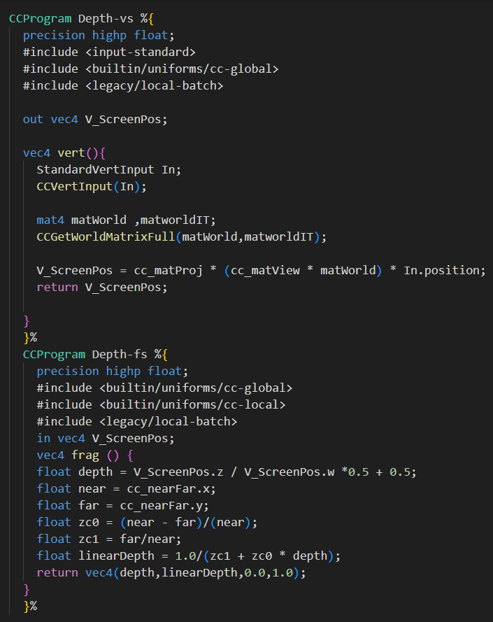 这个shader代码来自麒麟子老师的文章 Cocos Shader入门基础七:一文读懂深度图 - Creator 3.x - Cocos中文社区