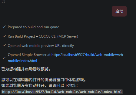 - 如何预览呢?是要通过editor预览吗?pink内点击启动按钮报无法启动预览,用agent发送启动指令,倒是能预览了,发现是启动了编译好的web-mobile版本,而且pink编辑器debug console没有任何信息,得去编辑器启动游戏通过dev tools查看日志并发现报错信息,预览游戏这一块不顺畅,企图通过pink无缝解决预览报错问题没法得逞,如果用构建编译好的we-mobile版本进行预览,因为没有sourcemap,日志信息更难理解(稍稍影响心态,信心-10%)