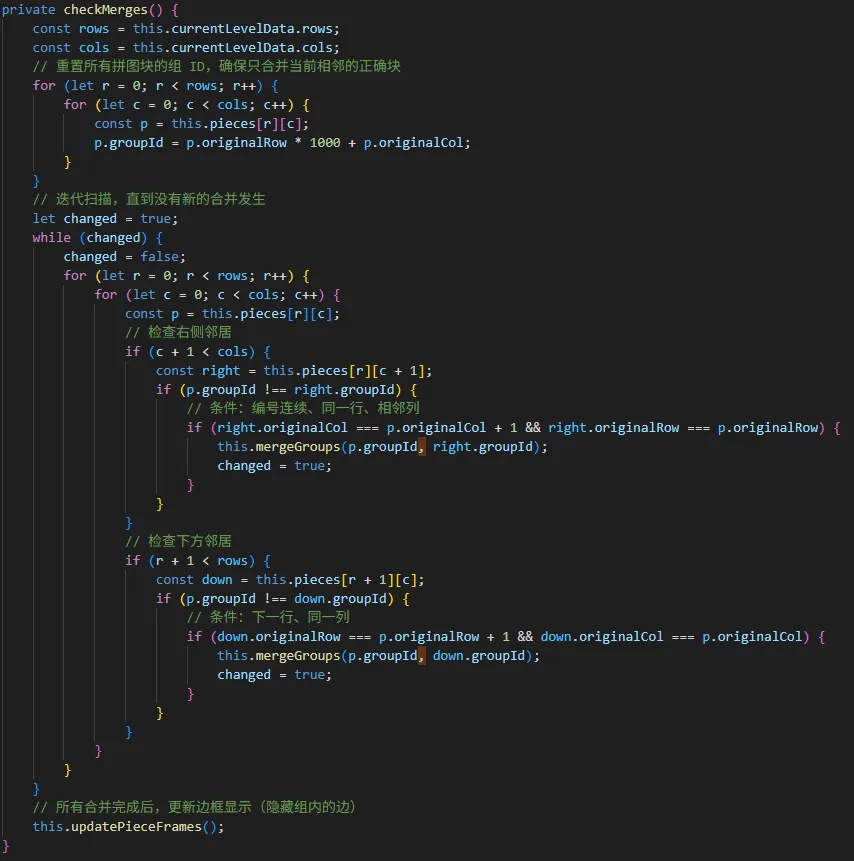 合并只需要将合并的拼图块分成同一个组,表示已经合并。