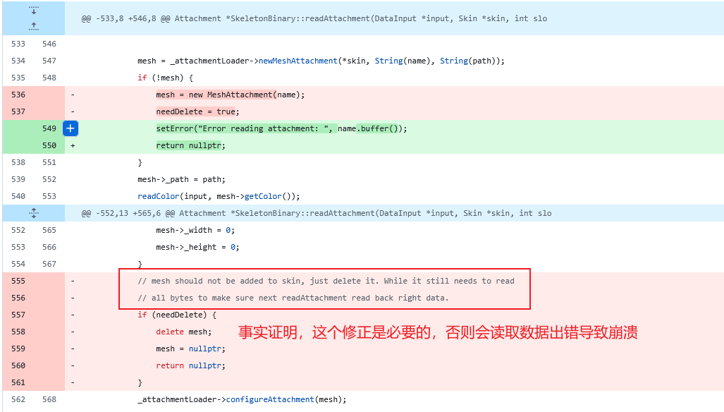一旦碰到错误立即返回nullptr,导致某些数据有缺失的spine报错。原代码是有保护措施的,这下一同步之后就把保护措施冲掉了。