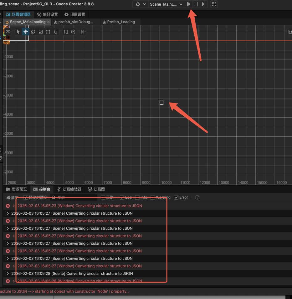 本来想调整布局方便截图,发现把”“属性检查器”移到中间位置后直接报错,游戏也无法运行,点了播放没反应,报错如下: