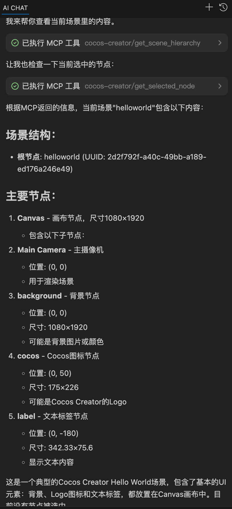 在此分享一个近期完成的开源插件:MCP Bridge。它的核心功能是为 Cocos Creator 编辑器提供 MCP(模型上下文协议)支持,使得外部 AI 助手能够与编辑器交互,实现一些自动化操作。