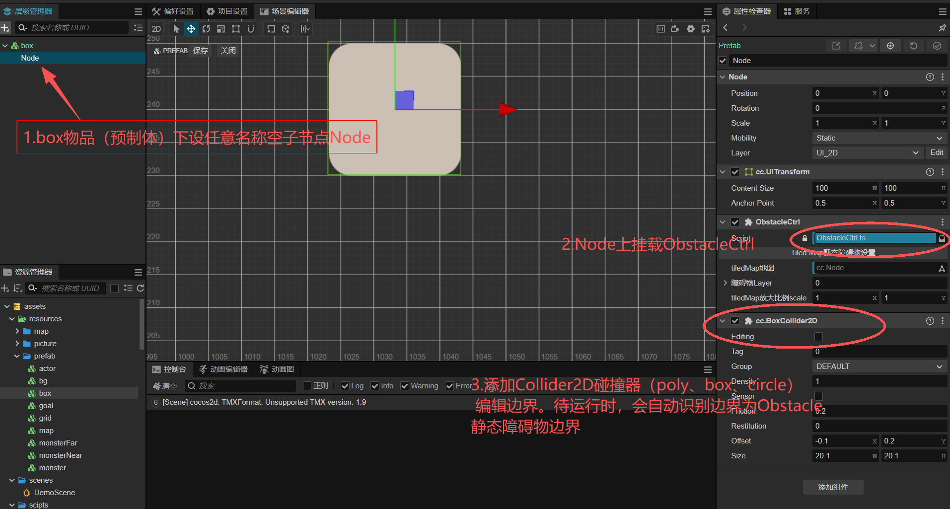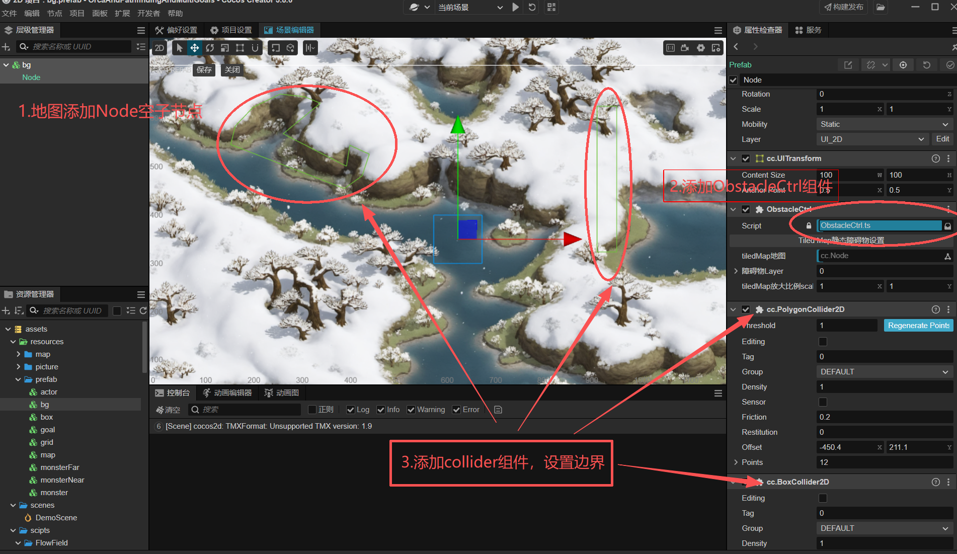 1. 在tMap节点上挂载TiledMap和ObstacleCtrl脚本;
